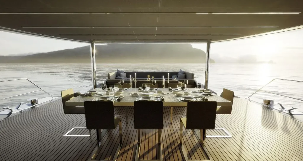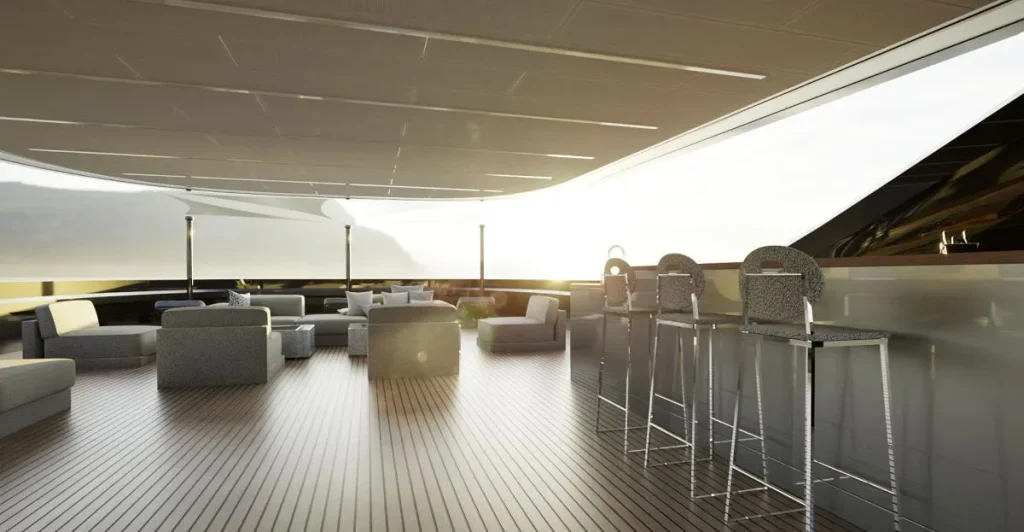The aft deck offers a fluid transition between the yacht’s exterior and interior spaces. A U-shaped seating arrangement and dining table make it ideal for al fresco dining. Storage solutions are thoughtfully integrated, maintaining a clutter-free environment. This design ensures a smooth journey from the outdoor deck to the luxurious saloon.