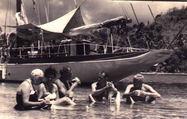 One day, when refitting after the ocean voyage alongside the deserted wharves, where there were only goats grazing amongst the ruins, a rich American from the newly established Mill Reef Club said, “Gee, what a lovely schooner, you wouldn’t take us for a sail down islands, would you?”